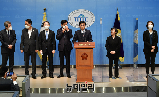 조승래 더불어민주당 과학기술정보방송통신위원회 간사 등 소속 의원들이 10일 국회 소통관에서 대통령실의 MBC 전용기 탑승 불허 통보 관련 규탄 기자회견을 갖고 있다.