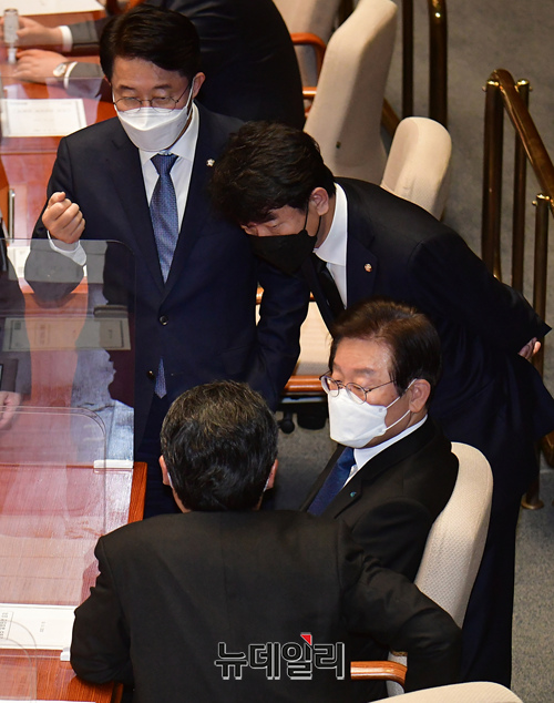 이재명 더불어민주당 대표와 정청래 최고위원, 김성환 정책위의장 등 소속 의원들이 10일 국회에서 열린 본회의에서 대화를 나누고 있다.