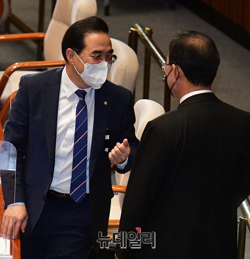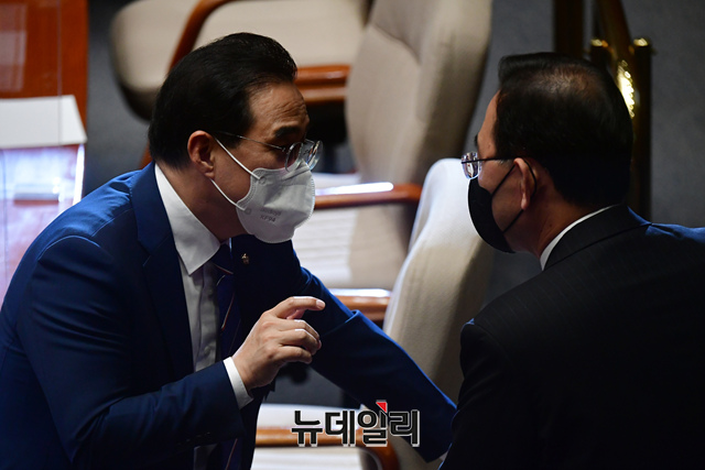 주호영 국민의힘 원내대표와 박홍근 더불어민주당 원내대표가 10일 국회에서 열린 본회의에서 대화를 나누고 있다.