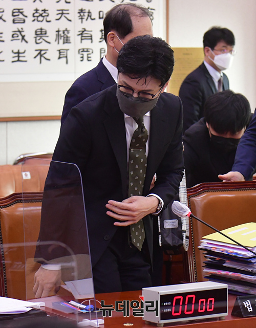 한동훈 법무부 장관이 14일 국회에서 열린 법제사법위원회 전체회의에 참석하기 위해 입장하고 있다.