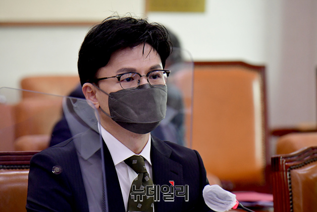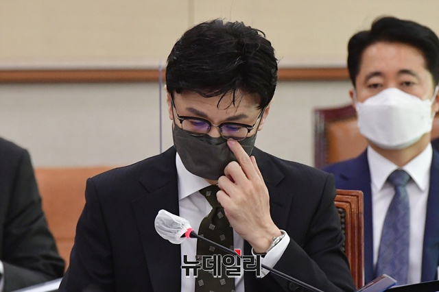 한동훈 법무부 장관이 14일 국회에서 열린 법제사법위원회 전체회의에 참석해 회의 시작을 기다리고 있다.