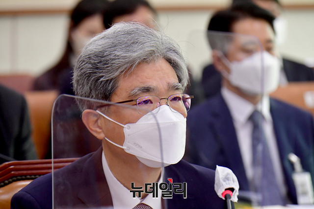 김상환 법원행정처장이 14일 국회에서 열린 법제사법위원회 전체회의에 참석해 회의 시작을 기다리고 있다.