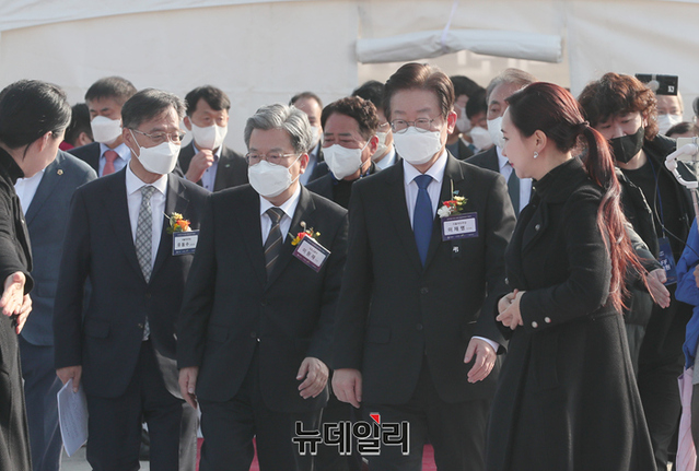 이재명 더불어민주당 대표, 배준영 국민의힘 의원 등 주요 참석자들이 15일 오전 인천 계양테크노밸리 공공주택지구 착공식에서 기념촬영을 하고 있다.