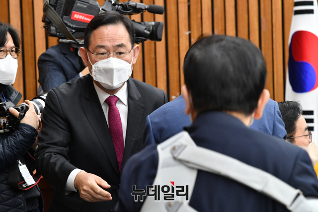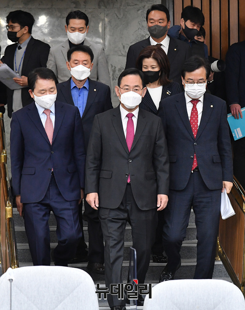 주호영 국민의힘 원내대표 및 지도부가 15일 오전 국회에서 열린 원내대책회의에 참석하기 위해 입장하고 있다.