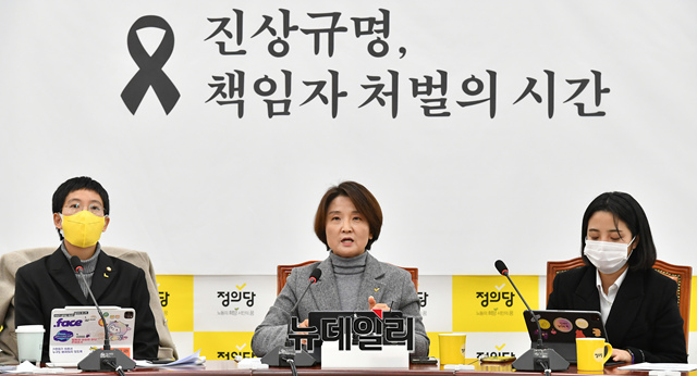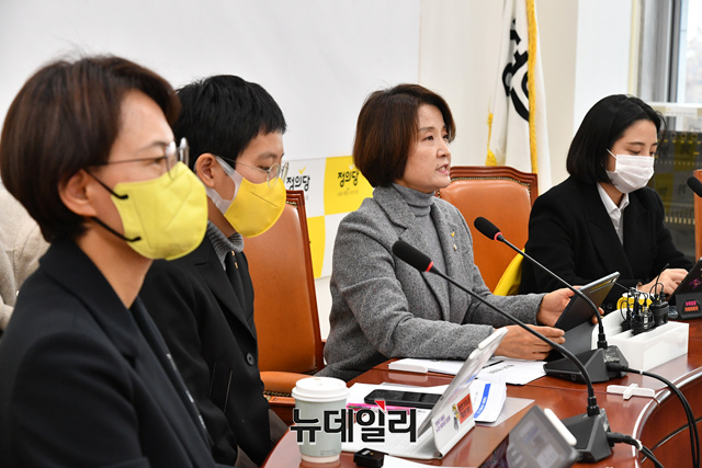 이은주 정의당 원내대표가 15일 국회에서 열린 의원총회에 참석해 발언하고 있다.