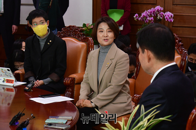 김진표 국회의장, 박홍근 더불어민주당 원내대표, 이은주 정의당 원내대표, 용혜인 기본소득당 원내대표가 15일 국회에서 이태원 참사 국정조사 요구서 채택 관련 논의를 하고 있다.