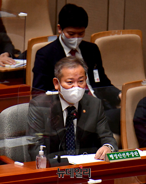 이상민 행정안전부 장관이 15일 국회에서 열린 예산결산특별위원회 전체회의에서 의원들의 질문에 답하고 있다.