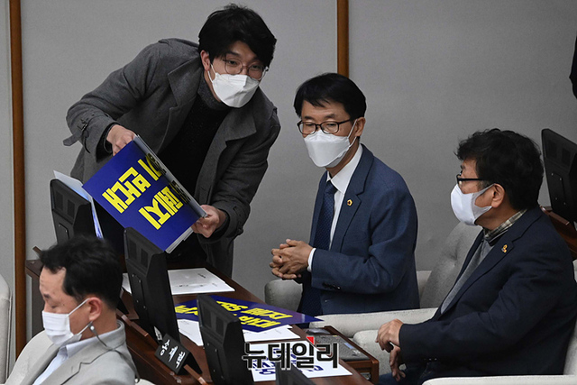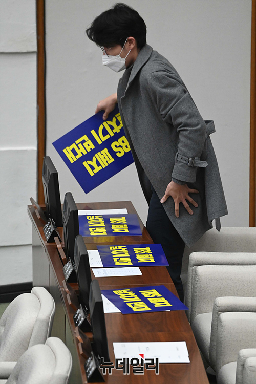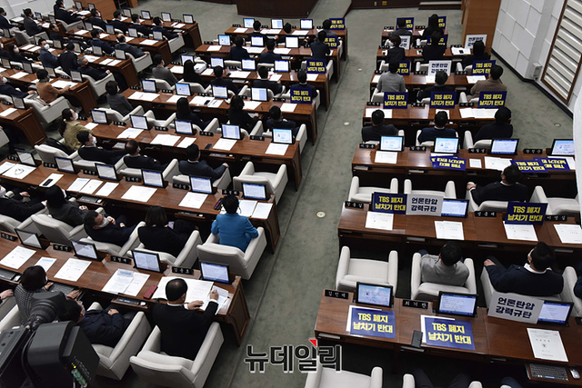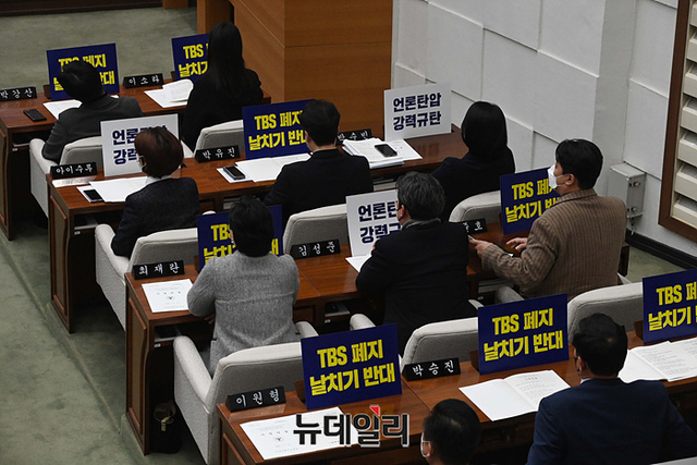 더불어민주당 서울시의회 의원들이 15일 오후 서울시의회 본회의에서 'TBS 설립 및 운영에 관한 조례 폐지' 조례안을 규탄하는 손팻말을 전달 받고 있다.