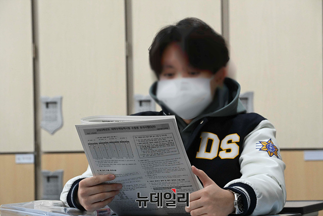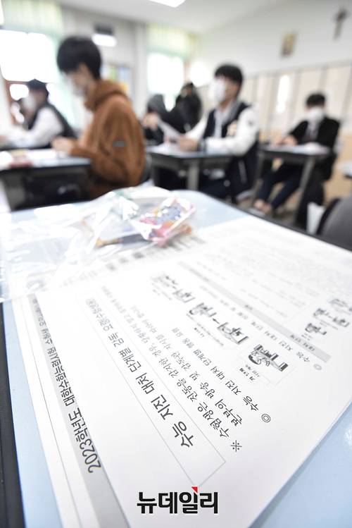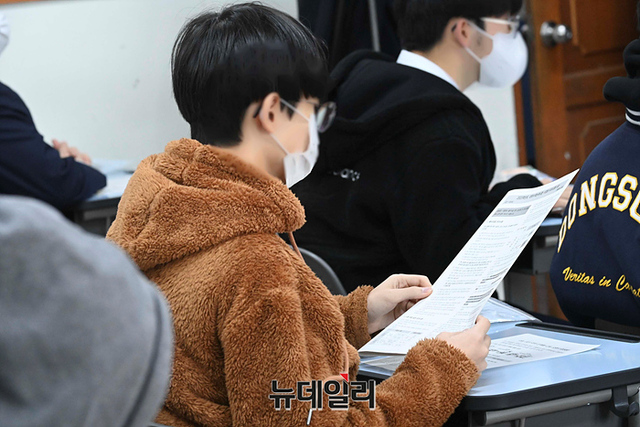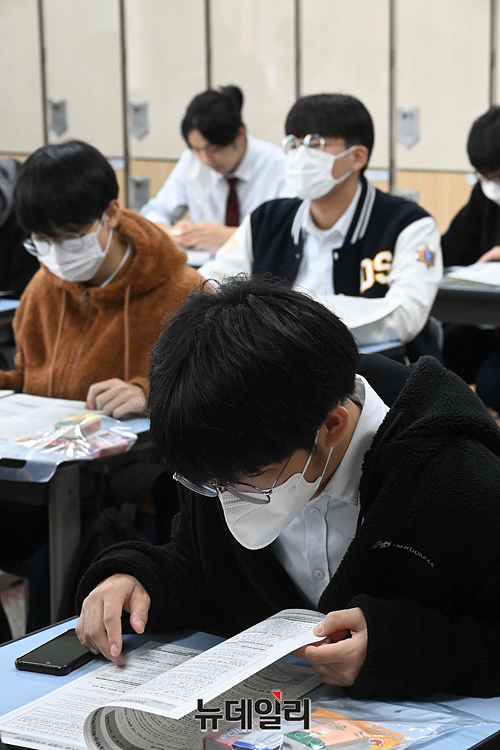 2023학년도 대학수학능력시험을 하루 앞두고 있는 16일 오전 서울 종로구 동성고등학교에서 수험생들이 시험 유의사항 내용을 보고 있다.
