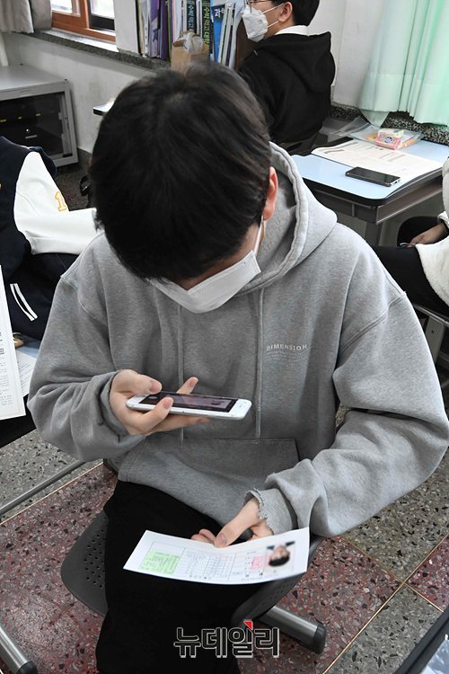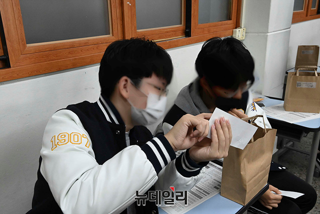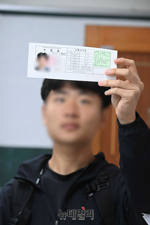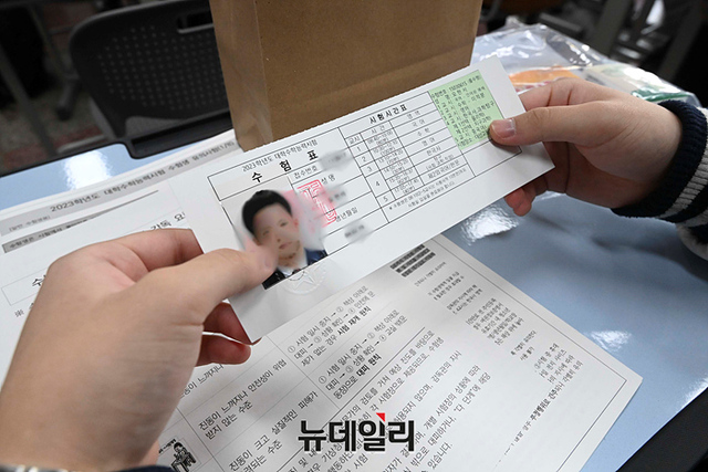 2023학년도 대학수학능력시험을 하루 앞두고 있는 16일 오전 서울 종로구 동성고등학교에서 수험생들이 수험표를 확인하고 있다.