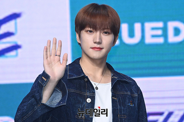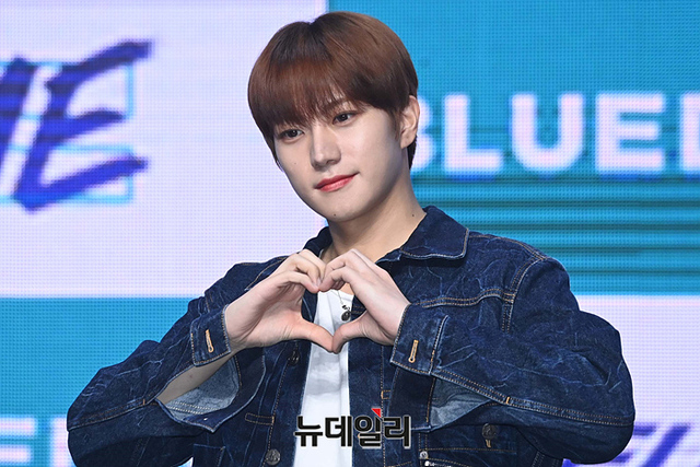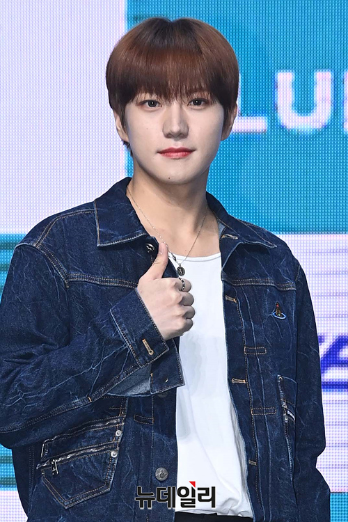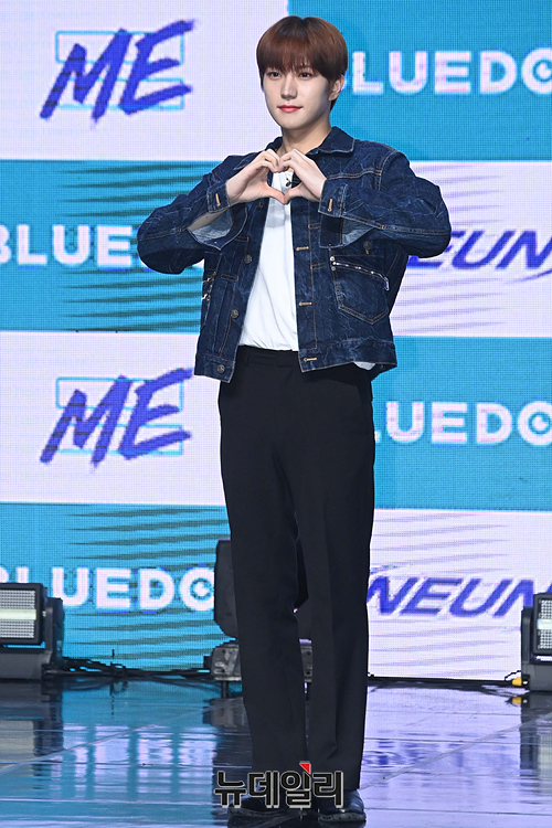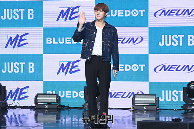 아이돌그룹 저스트비 멤버 JM이 16일 오후 서울 용산구 노들섬 라이브하우스에서 열린 세 번째 미니앨범 '는(=)' 발매기념 쇼케이스에서 포즈를 취하고 있다.