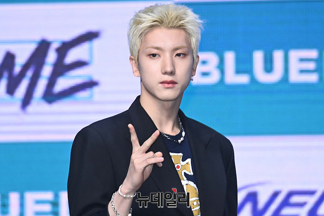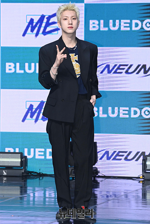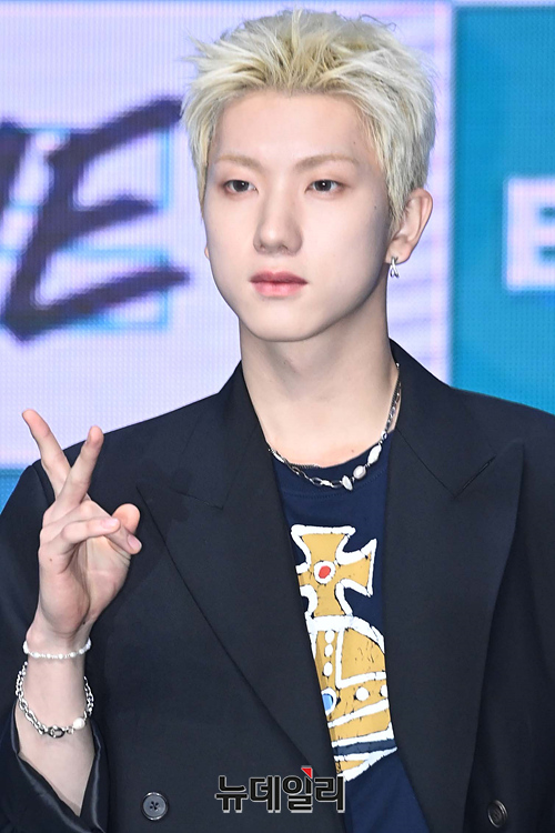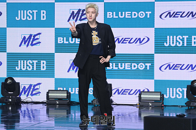 아이돌그룹 저스트비 멤버 전도염이 16일 오후 서울 용산구 노들섬 라이브하우스에서 열린 세 번째 미니앨범 '는(=)' 발매기념 쇼케이스에서 포즈를 취하고 있다.