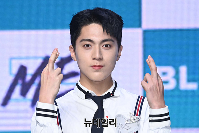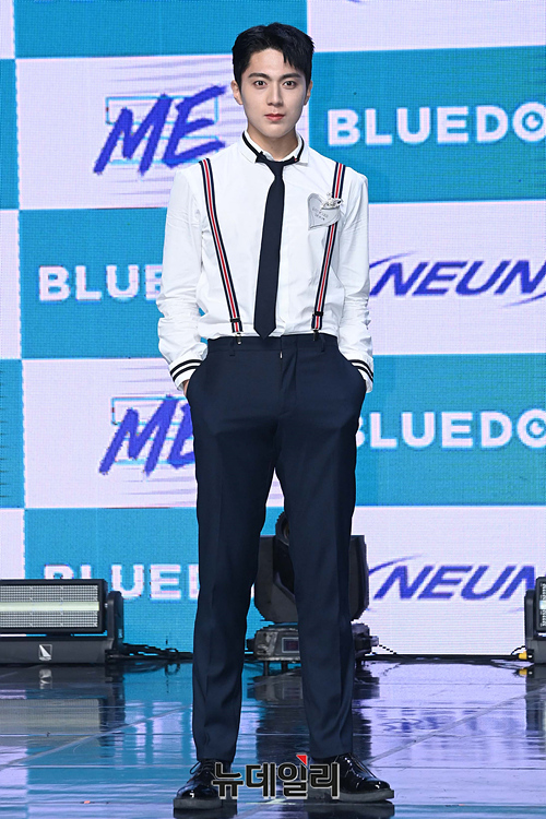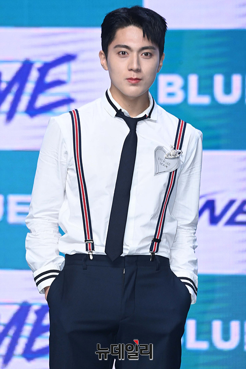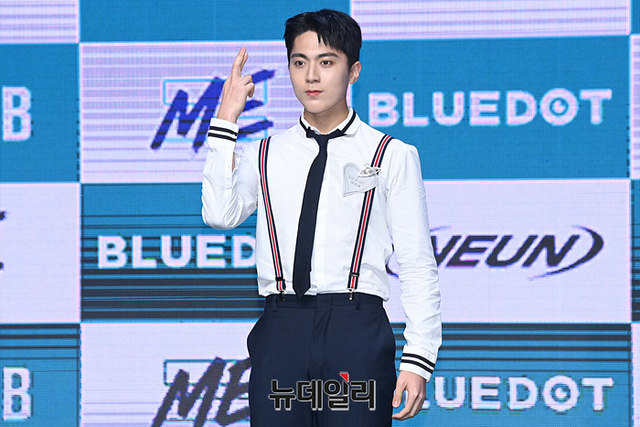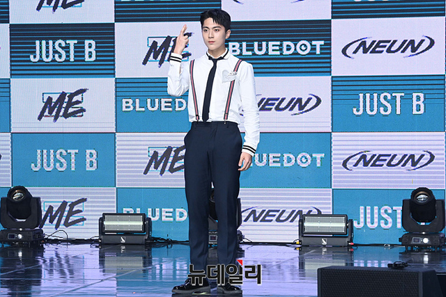아이돌그룹 저스트비 멤버 김상우가 16일 오후 서울 용산구 노들섬 라이브하우스에서 열린 세 번째 미니앨범 '는(=)' 발매기념 쇼케이스에서 포즈를 취하고 있다.