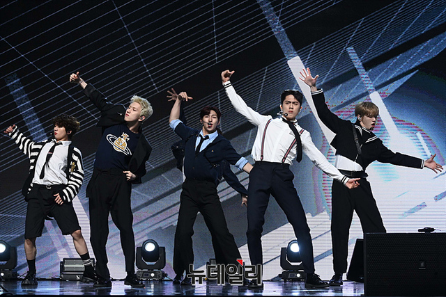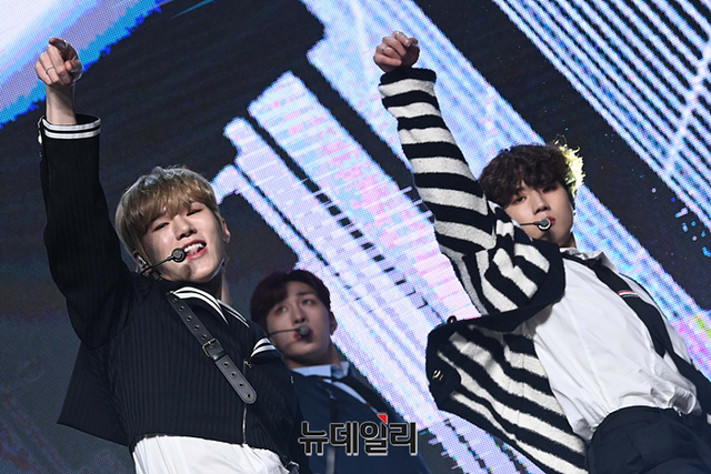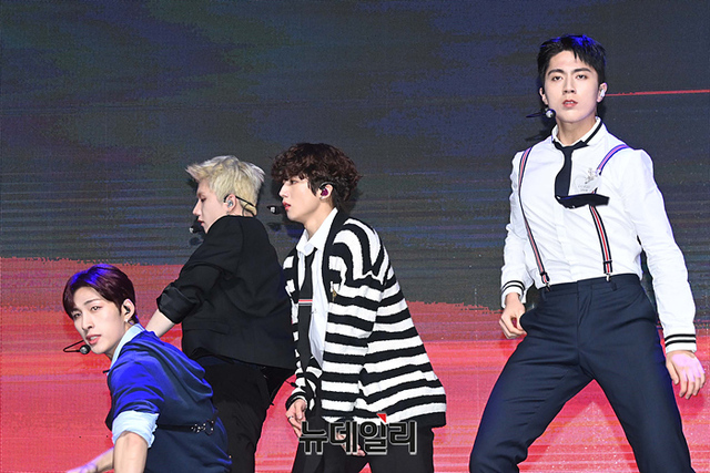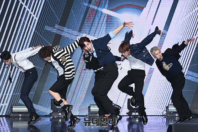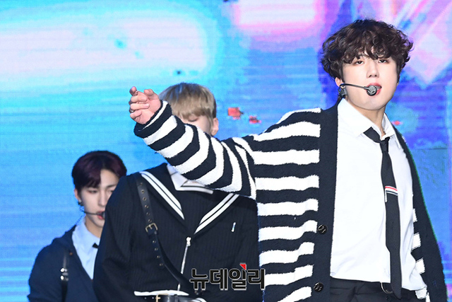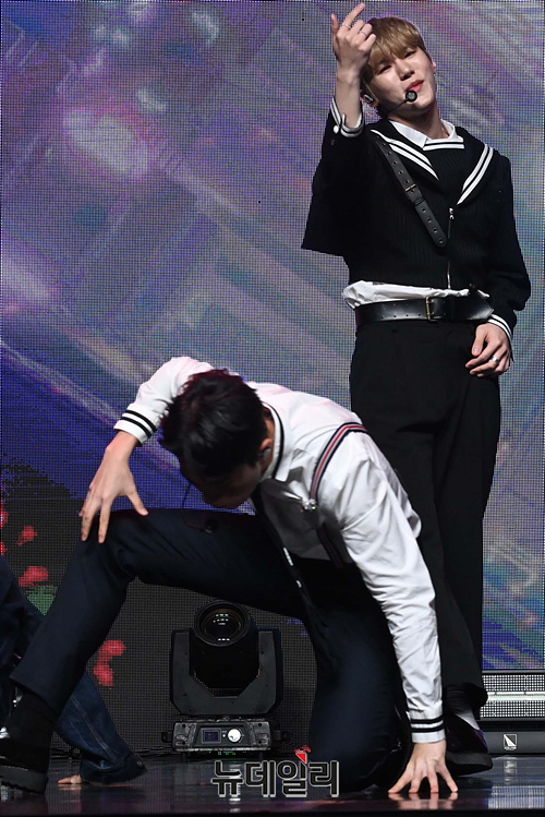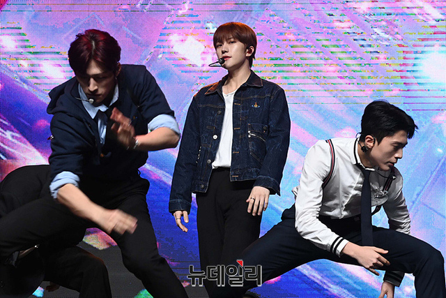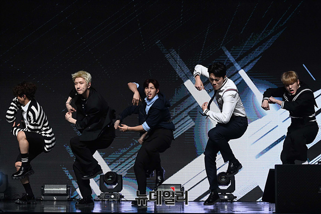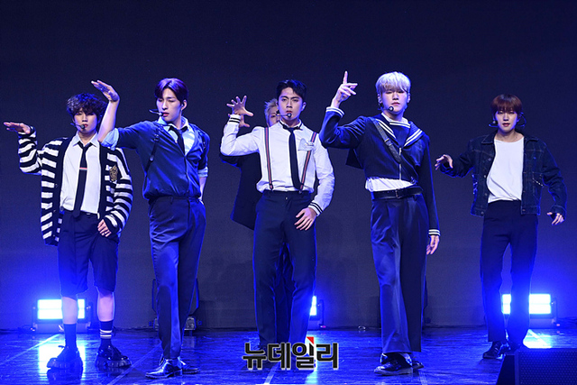 아이돌그룹 저스트비(임지민, JM, 이건우, 전도염, 배인, 김숭아)가 16일 오후 서울 용산구 노들섬 라이브하우스에서 열린 세 번째 미니앨범 '는(=)' 발매기념 쇼케이스에서 무대를 선보이고 있다.
