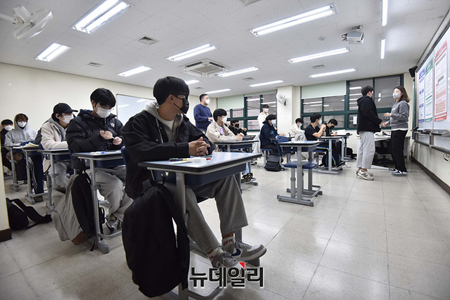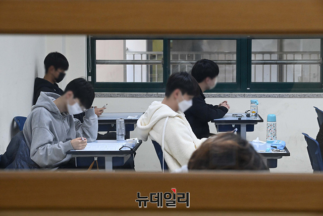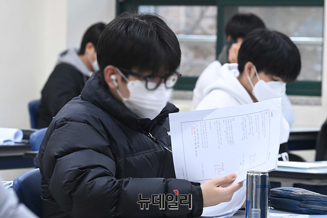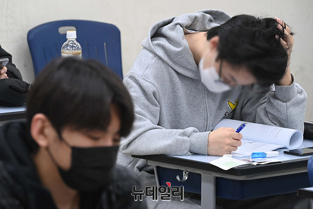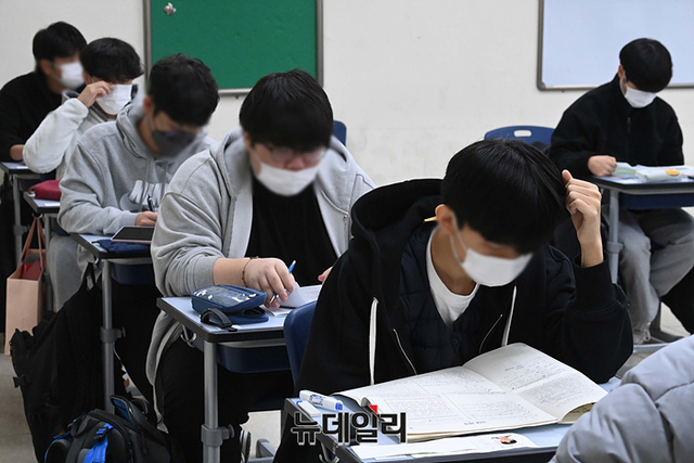 2023학년도 대학수학능력시험일인 17일 오전 서울 종로구 경복고등학교에서 수험생들이 수능 막바지 준비를 하고 있다.