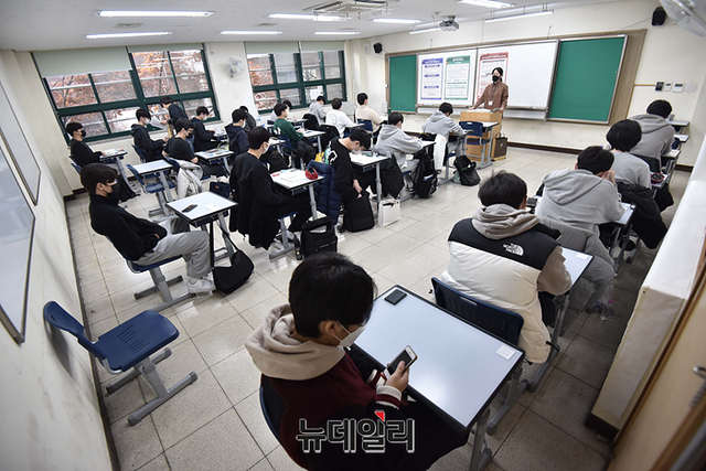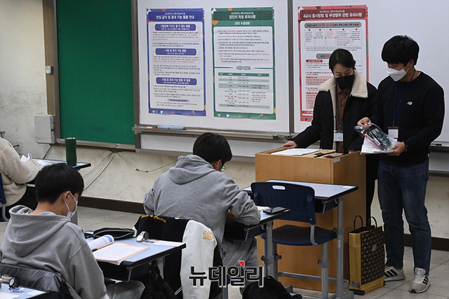 2023학년도 대학수학능력시험일인 17일 오전 서울 종로구 경복고등학교에서 시험감독 교사가 수험생들에게 시험 유의사항을 설명하고 있다.