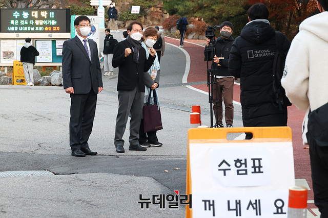 2023학년도 대학수학능력시험일인 17일 오전 서울 종로구 경복고등학교에서 조희연 서울시교육감이 수험생들에게 응원인사를 하고 있다. (사진=공동취재단)