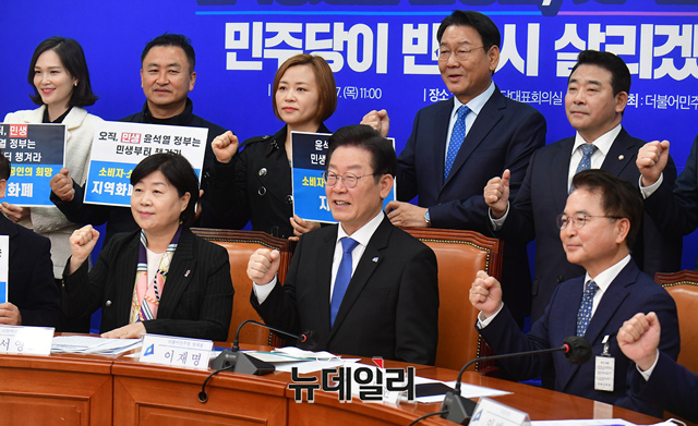 이재명 더불어민주당 대표 등 참석자들이 17일 오전 국회에서 열린 지역화폐 예산 확보를 위한 간담회에 참석해 기념촬영을 하고 있다.
