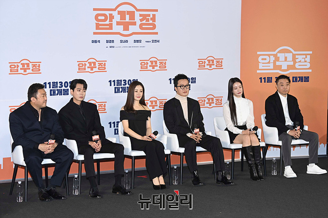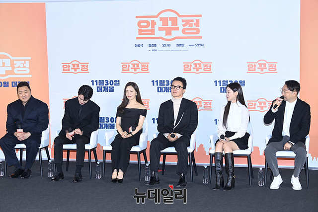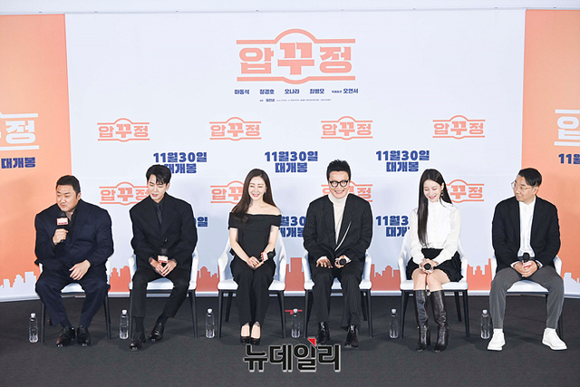 배우 마동석(왼쪽부터), 정경호, 오나라, 최병모, 오연서, 임진순 감독이 17일 오전 서울 CGV 용산아이파크몰에서 열린 영화 '압꾸정(감독 임진순)' 제작보고회에서 취재진의 질문을 듣고 있다.