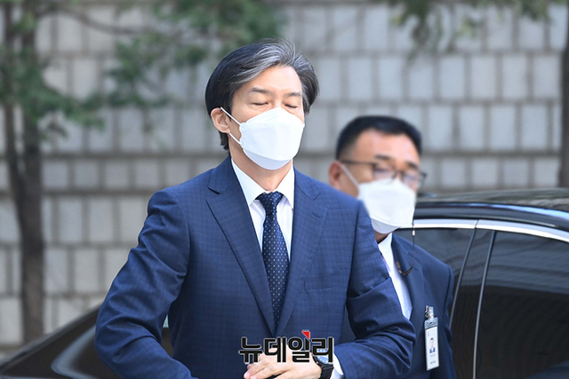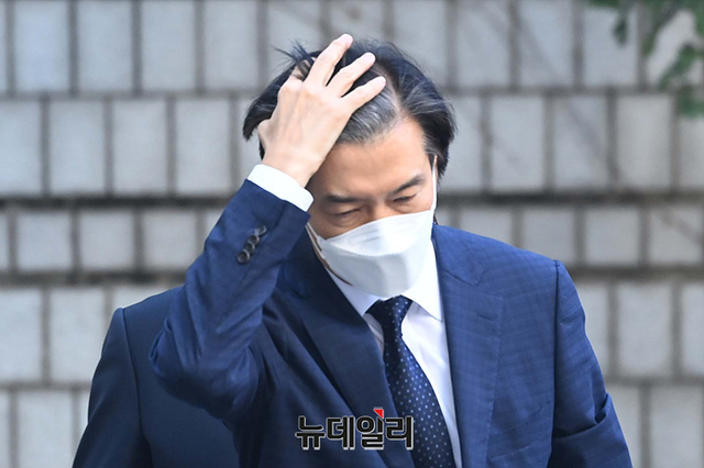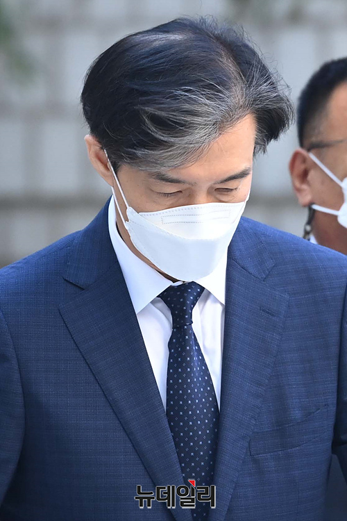 뇌물수수 등 혐의를 받고 있는 조국 전 법무부 장관이 18일 오전 서울 서초구 중앙지법에서 열린 공판에 출석하고 있다.