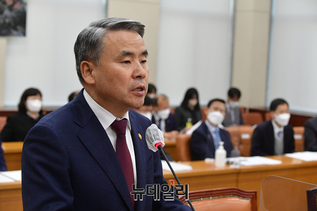 이종섭 국방부 장관이 18일 국회에서 열린 국방위원회 전체회의에 출석해 법안 의결 인사말을 하고 있다.