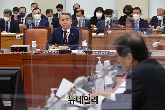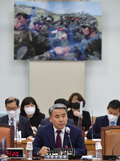 이종섭 국방부 장관이 18일 국회에서 열린 국방위원회 전체회의에 출석해 의원들의 질문에 답하고 있다.