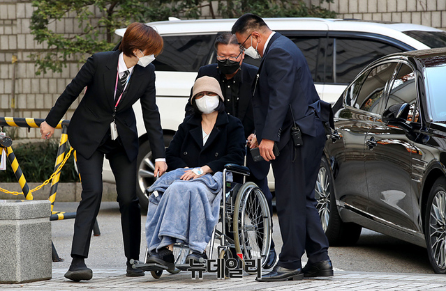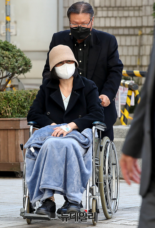 정경심 전 동양대학교 교수가 18일 오후 서울 서초구 서울중앙지법에서 열린 공판에 출석하기 위해 휠체어를 타고 이동하고 있다.