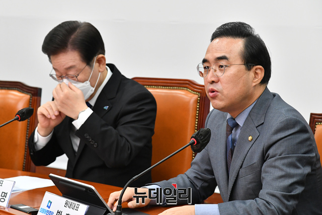 박홍근 더불어민주당 원내대표가 21일 국회에서 열린 최고위원회의에서 모두발언을 하고 있다.