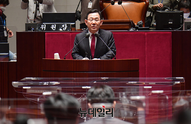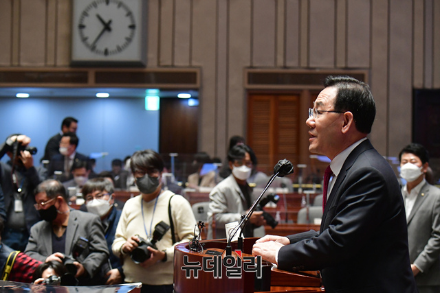주호영 국민의힘 원내대표가 21일 국회에서 열린 의원총회에서 모두발언을 하고 있다.
