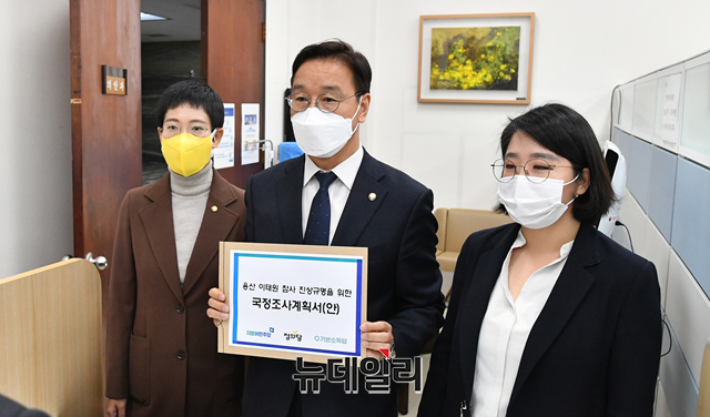 위성곤 더불어민주당 원내수석부대표, 장혜영 정의당 원내수석부대표, 용혜인 기본소득당 의원이 21일 국회 의안과에 용산 이태원 참사 진상규명을 위한 국정조사계획서를 제출하고 있다.