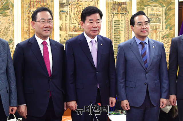 김진표 국회의장이 21일 국회에서 열린 교섭단체 원내대표 주례회동에서 양당 원내지도부와 기념촬영을 하고 있다. (왼쪽부터 장동혁 국민의힘 원내부대표, 주호영 원내대표, 김 의장, 박홍근 더불어민주당 원내대표, 진성준 원내수석부대표)