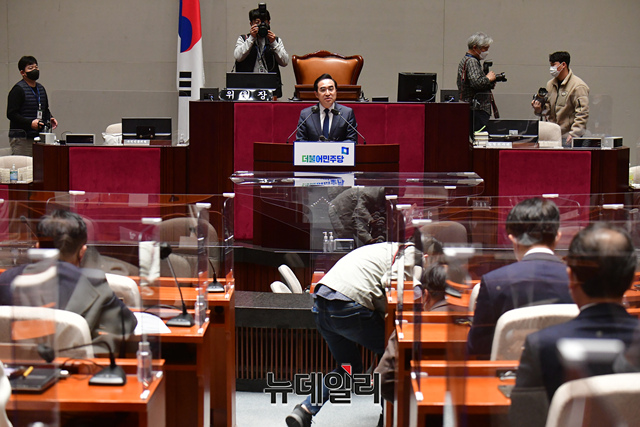 박홍근 더불어민주당 원내대표가 22일 국회에서 열린 의원총회에서 모두발언을 하고 있다.