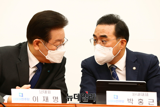 이재명 더불어민주당 대표와 박홍근 원내대표가 23일 국회에서 열린 최고위원회의에서 대화를 나누고 있다.