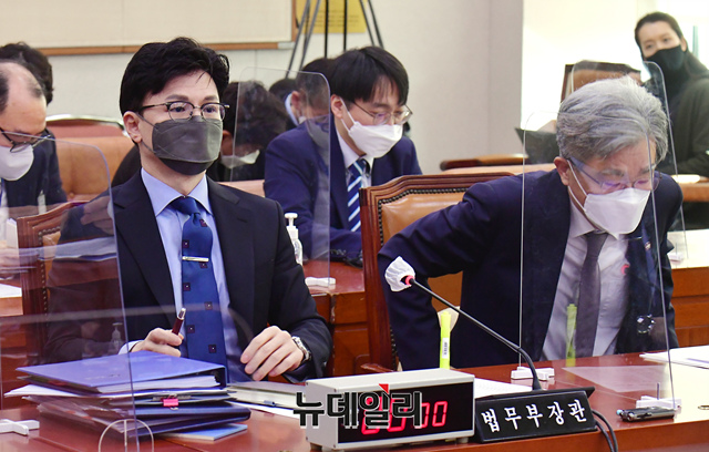 한동훈 법무부 장관이 23일 오전 국회에서 열린 법제사법위원회 전체회의에 출석해 질의에 답하고 있다.
