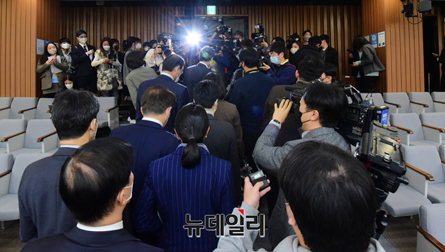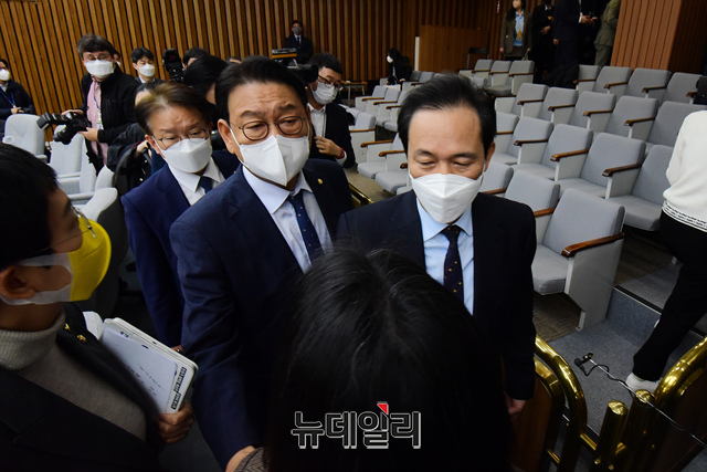 '용산이태원참사진상규명과재발방지를 위한 국정조사특별위원회 전체회의'가 24일 국회에서 열린 가운데 여야의 조사기관에 대한 협상이 길어지자 야당 의원들이 회의장을 떠나고 있다.