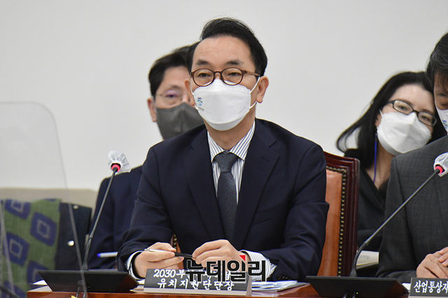 박정욱 2030부산세계박람회 유치지원단장이 24일 국회에서 열린 2030 부산세계박람회 유치지원 특별위원회 전체회의에 출석해 의원 질문에 답하고 있다.