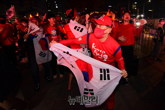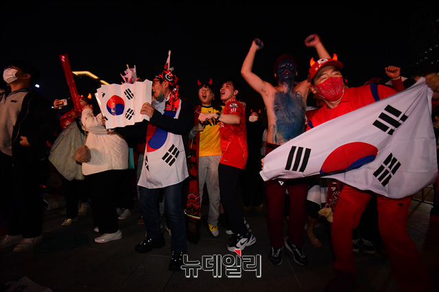 2022 카타르 월드컵 조별리그 H조 1차전 대한민국과 우루과이의 경기가 열린 24일 오후 서울 종로구 광화문광장에서 붉은악마와 시민들이 거리응원을 하고 있다.