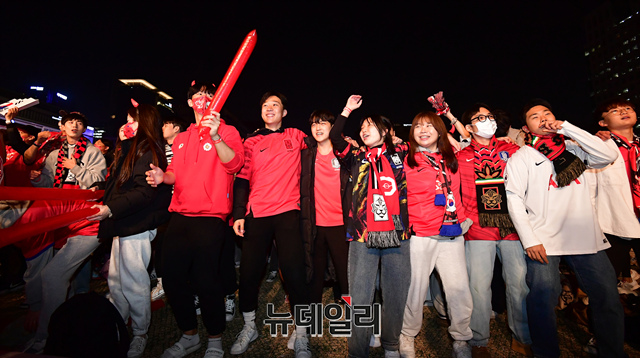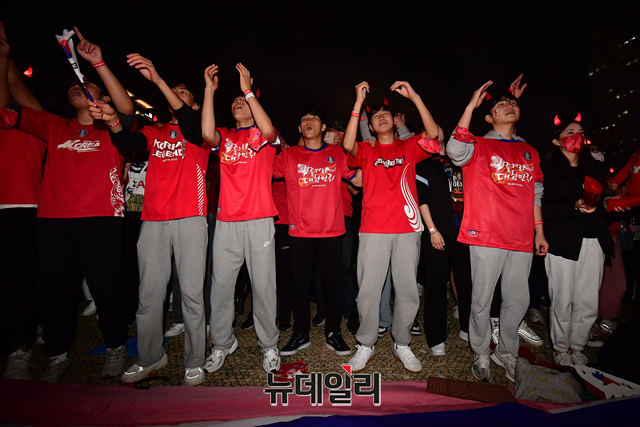 2022 카타르 월드컵 조별리그 H조 1차전 대한민국과 우루과이의 경기가 열린 24일 오후 서울 종로구 광화문광장에서 붉은악마와 시민들이 거리응원을 하고 있다.