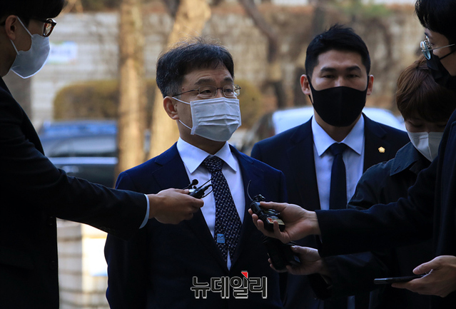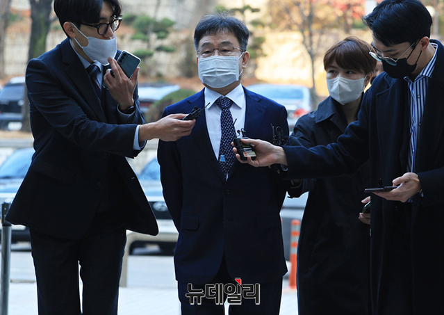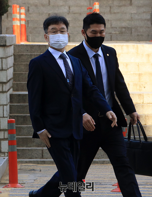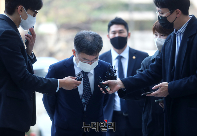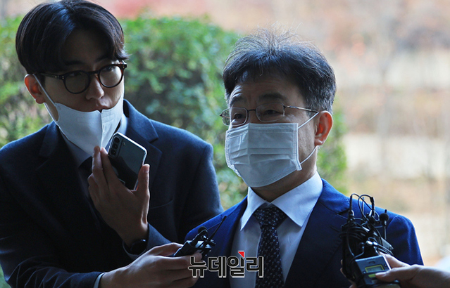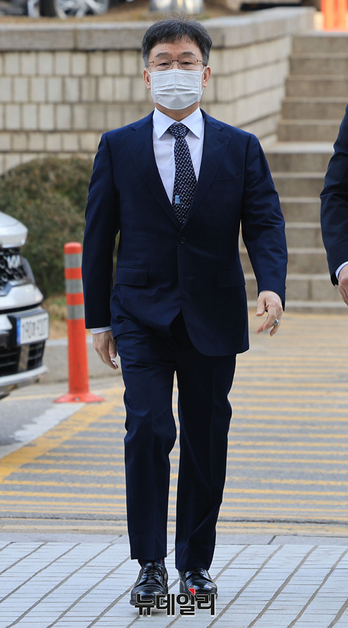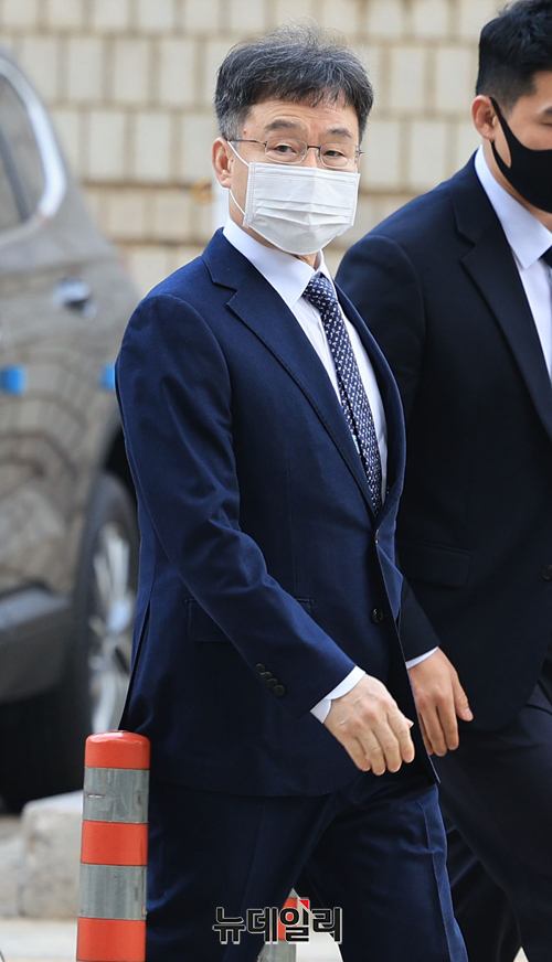 화천대유자산관리 대주주 김만배 씨가 25일 오전 서울 서초구 중앙지방법원에서 열린 대장동 개발 사업 로비·특혜 의혹 관련 1심 속행 공판에 출석하고 있다. 김 씨는 24일 자정 구속기한 만료로 출소했다.
