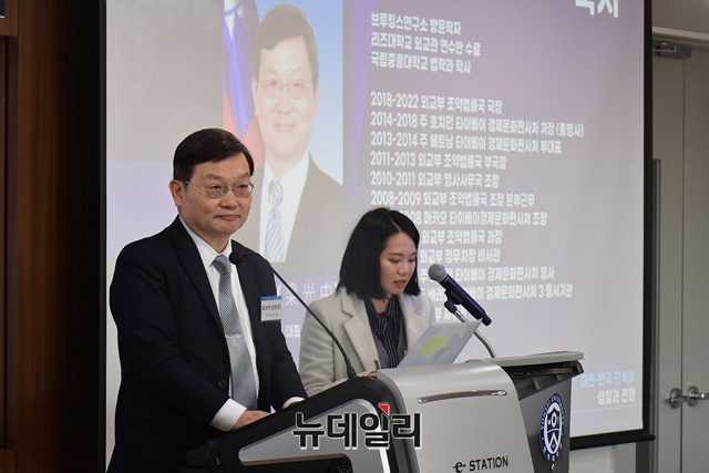 대만·한국 관계의 성찰과 전망 심포지엄이 26일 오후 서울 서대문구 연세대학교 미우관에서 열린 가운데 양광중 주한 대만대표부 대표가 축사를 하고 있다.강흥구 태평양시대위원회 이사장의 개회사를 시작으로 양광중 주한 대만대표부 대표, 백우열 연세대학교 정치외교학과 교수가 축사를 김명섭 연세대학교 정치외교학과 교수가 환영사를 맡았다.'1992년 이전의 대한민국과 중화민국'을 주제로 열린 제1세션에는 김명섭 연세대학교 교수, 홍연주 대한민국역사박물과 학예연구사가 발표를 조희용 전 주케나다 대사와 서상문 환동해미래연구원 원장이 논평을 진행했다.'대만·한국 관계의 성찰과 전망'을 주제로 열린 제2세션에는 박병섭 서울사이버대학교 교수, 필수연 주한대만대표부 정무 참사가 발표를 남광규 고려대학교 아세아문제연구원 통일과 국제평화센터장, 김진호 단국대학교 정치외교학과 교수가 논평을 맡았다.이날 심포지엄에는 사단법인 태평양시대위원회가 주최하고 태평양아케데미, 연세대학교 BK21 역사정치학 Lab이 주관, 주한대만대표부가 후원했다.