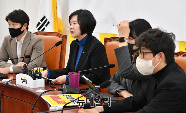 이정미 정의당 대표가 28일 국회에서 열린 상무위원회에서 모두발언을 하고 있다.