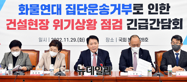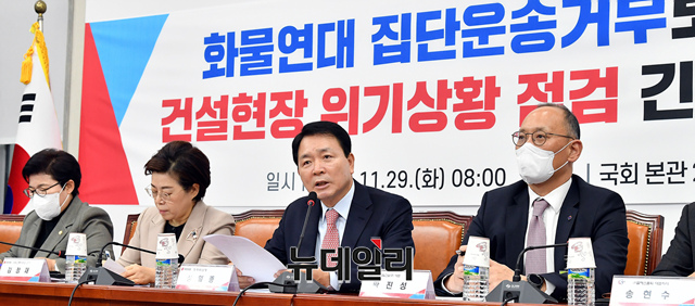 성일종 국민의힘 정책위의장이 29일 국회에서 열린 화물연대 집단운송거부로 인한 건설현장 위기상황 점검 긴급간담회에 참석해 모두발언을 하고 있다.