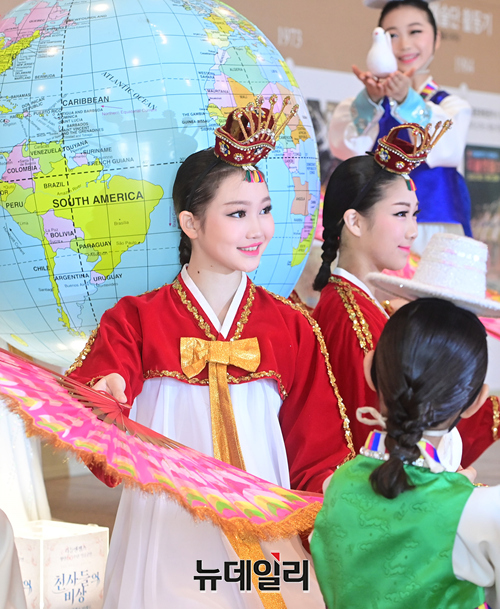 리틀엔젤스예술단(단장 정임순)이 창단 60주년 기념공연을 앞둔 1일 오전 서울 종로구 세종문화회관에서 지구본과 비둘기 소품으로 평화 기원 메시지를 전달하는 퍼포먼스를 하고 있다.