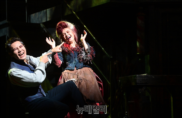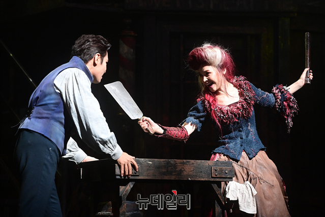 배우 이규형, 전미도가 6일 오후 서울 송파구 샤롯데씨어터에서 열린 뮤지컬 '스위니토드' 프레스콜에서 하이라이트 장면을 시연하고 있다.