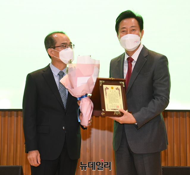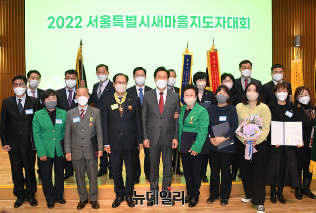 오세훈 서울시장이 6일 오후 서울시청에서 열린 2022 서울특별시 새마을지도자대회에서 감사패를 수여받고 기념촬영을 하고 있다. (사진=서울시)
