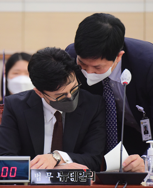 한동훈 법무부장관이 7일 국회에서 열린 법제사법위원회 전체회의에 참석해 보좌진과 대화를 나누고 있다.