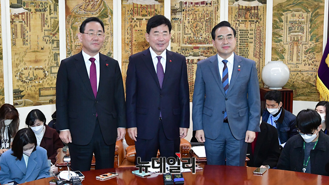 김진표 국회의장과 주호영 국민의힘 원내대표, 박홍근 더불어민주당 원내대표가 8일 오전 국회에서 국회의장 주재로 열린 여야 원내대표 회동에서 기념촬영을 하고 있다.