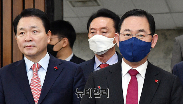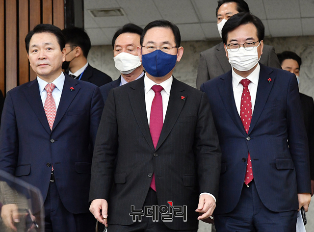 주호영 국민의힘 원내대표가 9일 국회에서 열린 원내대책회의에 참석하기 위해 입장하고 있다.