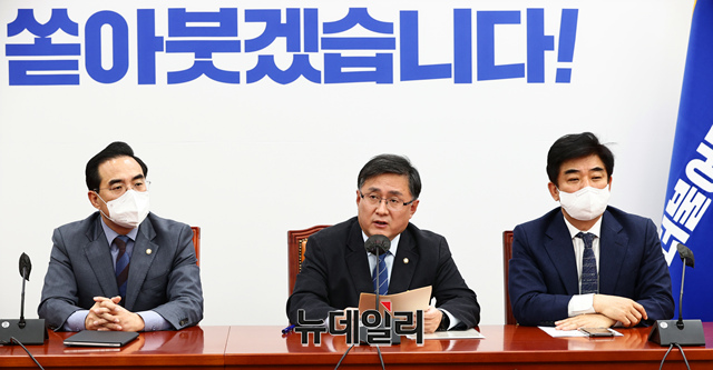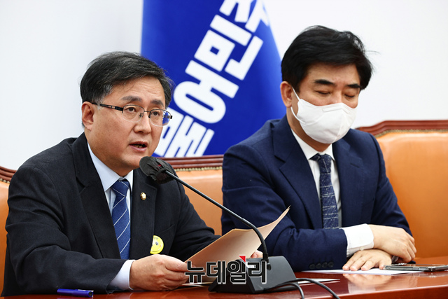 김성환 더불어민주당 정책위의장이 13일 오전 국회에서 열린 원내대책회의에 참석해 모두발언을 하고 있다.