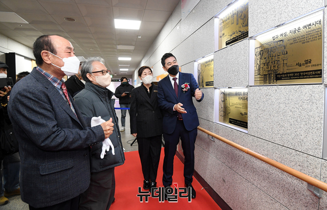 오신환 서울시 정무부시장이 13일 오전 서울시청에서 열린 '2022 서울시 명예의 전당 서울의 얼굴' 동판 제막식에서 제막식 직후 기념촬영을 하고 있다. (사진=서울시)